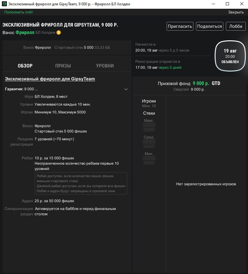 Доступ к бесплатным турнирам открывается за создание аккаунта по ссылкам от GipsyTeam и прохождения верификации в руме. Сам турнир можно найти во вкладке «Турниры» – «Фрироллы».