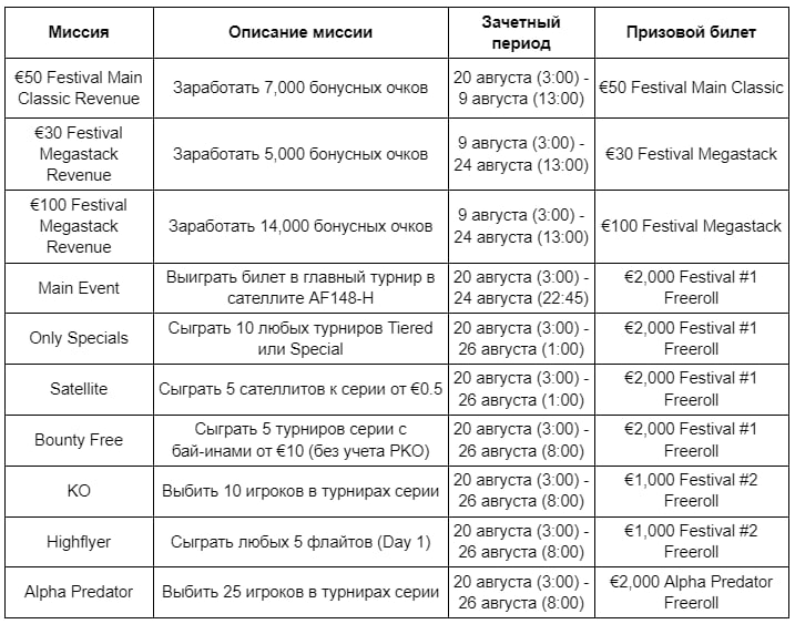 ✅ За выполнение простых миссий во время серии можно получить билеты на серию и фрироллы с гарантиями €1,000 и €2,000. Перед выполнением каждой требуется регистрация в меню Missions клиента. В носновном, задания связаны с фестивалем: например, выбить 25 игроков из турниров или сыграть 5 сателлитов.