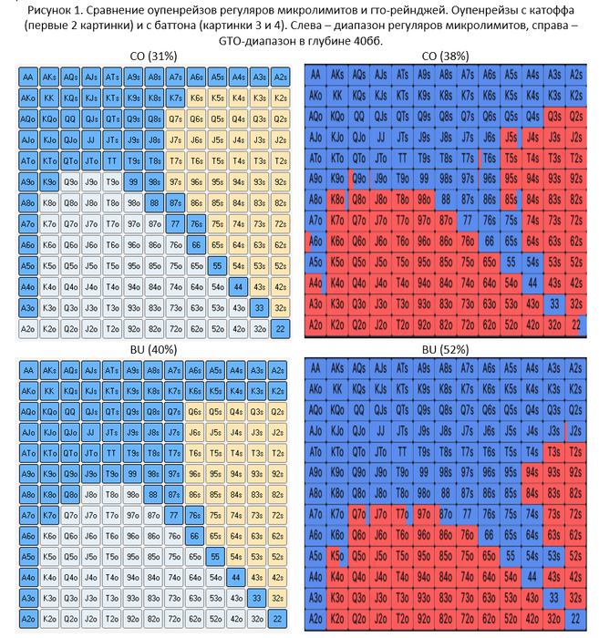 📕 Узкий диапазон опенрейза с поздних позиций. Анализ поля показывает, что в среднем игроки открывают 31% рук с катоффа и 40% с баттона, хотя по GTO должны открывать 38% и 52% (см. фото). Школа рекомендует смело играть по GTO и даже шире из-за проблемы номер два...