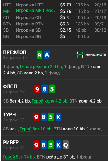Раздача: хиро открывает АА и получает колл от баттона (39/7, стек 136bb) SB (38/12, 49bb).