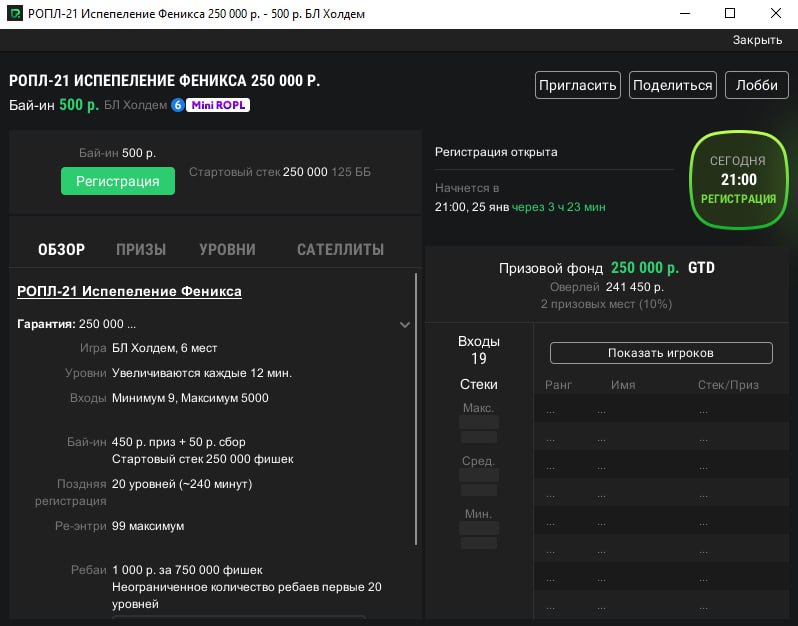 🕺 19:00, турнир-открытие за 500 рублей с гарантией 400,000.