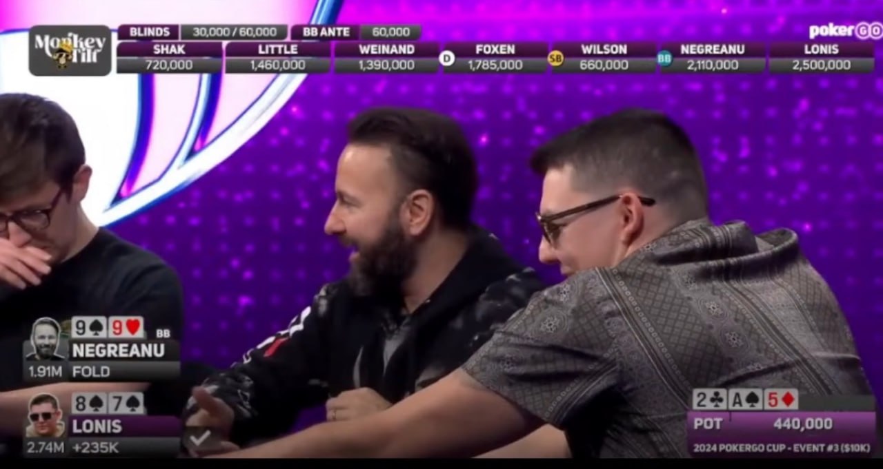 Сегодня эту тему жарко обсуждают в твиттере — после того, как Мэтт Берки высмеял в своем подкасте Solve for Why Даниэля Негреану. На финальном столе турнира PokerGo Cup за $10,000 чиплидер Джесси Лонис открылся с UTG с 8♠️7♠️, Даниэль (будучи вторым стеком) защитил ББ с 9♠️9♥️ — и просто сфолдил девятки на контбет 1 ББ на флопе 2♣️A♠️5♦️. «Совет дня: если вы не купили сет на флопе, деньги вкладывать в банк больше не нужно», — посмеялся Берки 🫠
