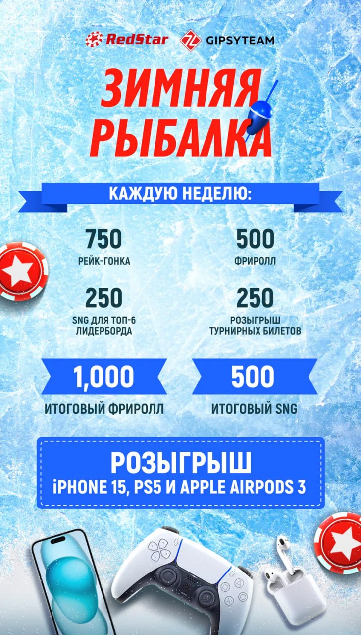 🐟 Зимняя рыбалка. С понедельника все участники акции получают очки за игру на RedStar Poker. Для квалификации в еженедельные фрироллы на $500 достаточно набирать всего 1,500 очков — это очень просто! Например, всего за $1 рейка в день вы уже получите 250 очков (за игру несколько дней подряд баллов будет еще больше). Если квалифицируетесь хотя бы в 2 турнира, получите билет в финальный фриролл на $1,000. А еще за каждые 500 очков мы начисляем билеты на финальный розыгрыш iPhone 15, PS5 и Airpods 3.