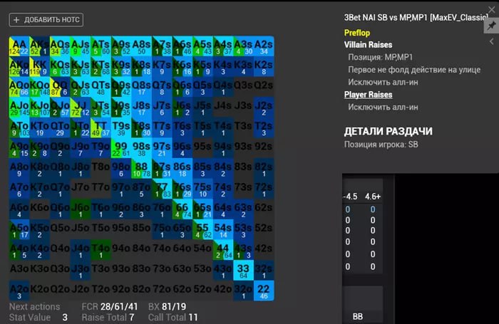 🥸 Трибетить вас будут очень тайтово. Солвер умеет довольно переставлять даже UTG-рейзера (с 6-11% диапазона), а вот поле — нет (2-6%). Ресерчи показывают, что блефов вы увидите крайне мало, вас будут 3-бетить почти сплошь премиум-руки (смотрите скриншот внизу).
