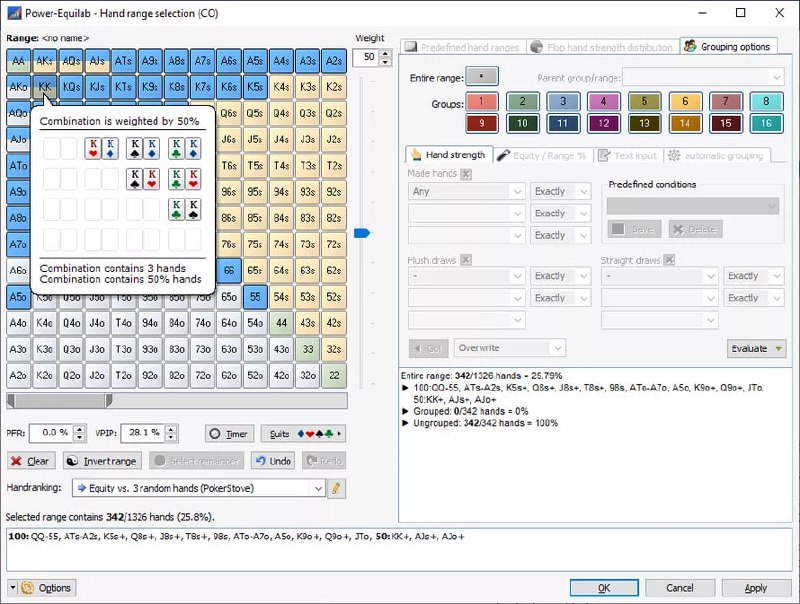🔥 Power-Equilab. Новинка от автора знаменитого калькулятора Equilab. Рассчитывает эквити для рук или диапазонов на каждой улице. Покажет, как часто попадете во флоп и останетесь впереди рейнджа соперника к шоудауну. Умеет учитывать «вес» рук, строить «тепловые карты» и графики эквити.