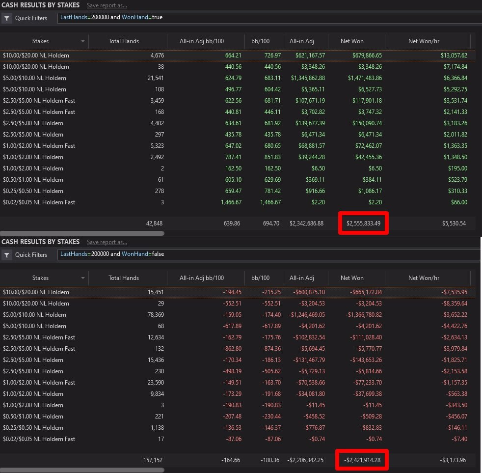 👨💻 Вот я открываю свою базу рук. За 200,000 раздач выиграл $134,000. Супер! Но пока я играл, постоянно чувствовал себя ужасно, был в вечном стрессе. Объяснить это просто, достаточно поставить рядом в трекере выигранные банки и проигранные. Я не просто заработал $134k — я выиграл $2.56 млн и проиграл $2.42 млн. И пока я проигрывал эти $2.42 млн, очень много расстраивался. Соотношение профита к потерям всего 1.06! А людям, напомню, часто некомфортно даже 1.5.