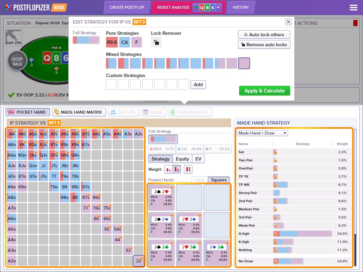 👉 Пример. SB (мы) против BB, флоп Q♠️8♠️3♦️. Мы можем подсказать солверу, что в ответ на чек оппонент будет ставить слишком часто — куда чаще, чем предлагает GTO. Частоту ставки можно вручную увеличить в разделе Set strategy («задать стратегию») и зафиксировать («залочить») для пересчета стратегии. Солвер тут же жестко понизит оптимальную частоту контбета для SB — при этом диапазон чека станет сильнее.