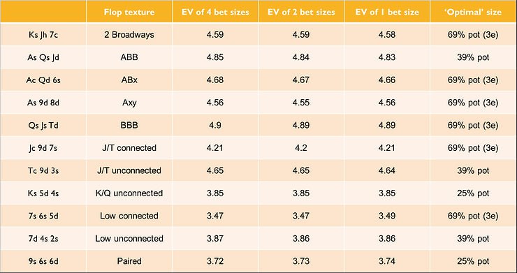 👇 Посмотрите на таблицу внизу. Там 11 разных текстур флопов, для каждого рассчитано EV ставки с 4 возможными сайзингами, двумя и одним. Самая большая потеря EV, которую мы получим, используя 1 сайзинг — всего 2 ББ на 100. И при этом находим стратегию, которую легко запомнить и использовать за столами.