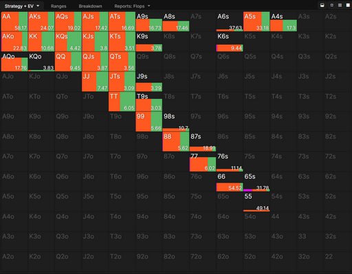 🔥 А потом появился GTO Wizard AI. Я рассчитал там один оптимальный сайзинг для того же спота — и получил очень простую стратегию: 39% пота в 76% случаев, остальное — чек. И по сравнению с двумя сайзингами мы даже ничего не теряем в EV! Только по сравнению с четырьмя — и то всего 1 ББ на 100. Но 4 всё равно никто никогда не запомнит, а вот 1 — очень легко. Это может каждый. Я уверен, что искусственный интеллект вот-вот в корне изменит покерное обучение!