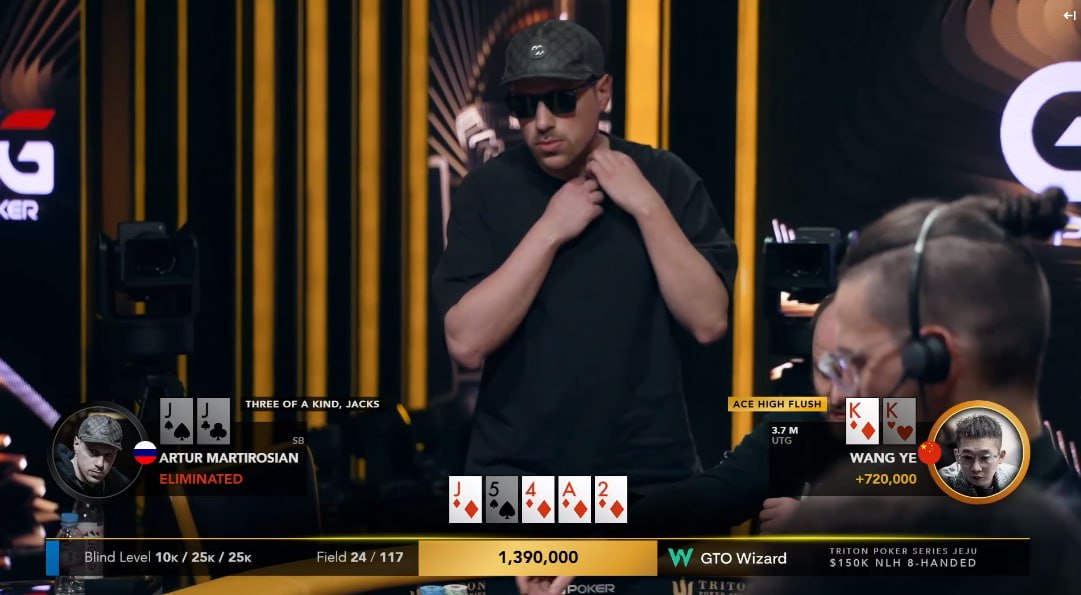 😔 В турнире за $150,000 тоже драма! Турнир собрал 117 входов, осталось 23 игрока. Только что за 4 человека до ITM вылетел Артур Мартиросян (JJ<KK, причем не помог даже J-хай флоп), для которого это был шанс отмазать неудачную серию. Чемпион получит $4.2 млн. Большие стеки у Никиты Бодяковского и Алекса Кулева, за их приключениями можно следить в русскоязычной трансляции: в комментаторской сегодня к Дмитрию Шахову присоединился Аврора. Сам Алексей отыграл 6 турниров, в ITM попасть нигде не удалось.