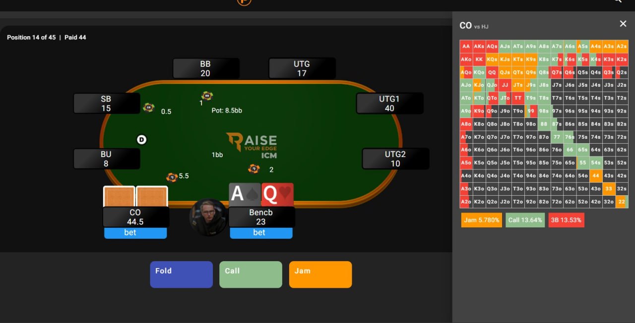💪 Ставим олл-ин! Модель ICM подразумевает множество подстроек. Решения основываются на балансе риска и награды. Это не просто оверфолд! Конкретно в этом случае хоть сколько-то агрессивный оппонент (даже не берем GTO-чарты) выбросит 2/3 того, что он 3-бетнул — и даже в случае колла у нас будет эквити. Так что легко пушится не только AQ, но и KQ, например.