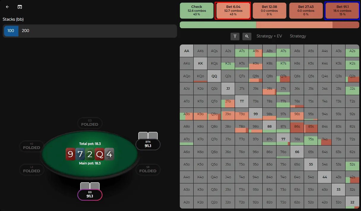 3️⃣ Мелкие проб-беты на ривере. Проб-бет — ставка от игрока без позиции после того, как агрессор чекнул на предыдущей улице. Баттон зарейзил, вы защитили ББ, на флопе 9♥️7♦️2♣️ заплатили контбет. Терн Q♥️ сыграли чек-чек, ривер 4♠️. Солвер в основном выбирает между чеком и мелким блокбетом, отправляя в бет средние руки, в первую очередь вторую пару (9х). А с частью сильнейших рук (Q7, Q2, 22) и блефов и вовсе пушит 91 ББ в 18 ББ.