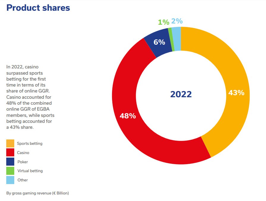 ♠️ А что с покером? Для большинства компаний онлайн-покер остается нишевым: всего 6% прибыли против 48% у казино и 43% у ставок. Не густо! Впрочем, Европа давно уступает в популярности другим рынкам, в особенности Азии и США.