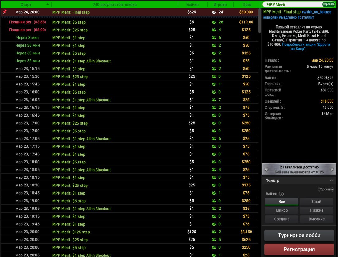 Сателлиты можно найти в лобби ПокерОК во вкладке "Приватный". Дорога на Кипр состоит из турниров пяти видов бай-инов: