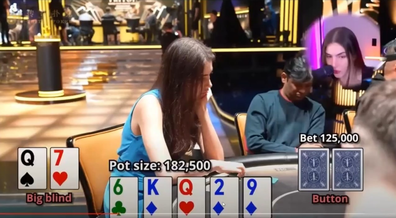 👉 Глубина около 25 ББ. Баттон открылся 2 ББ, Александра защитила на BB Q♠️7♥️. На флопе 6♣️K♦️Q♥️ сыграли чек-чек, на терне 2♦️ Ботез заплатила полбанка. На ривере 9♦️ оппонент на чек запушил 200% пота, под олл-ин Ботез. Шахматистка заплатила и удвоилась, оппонент макнул.