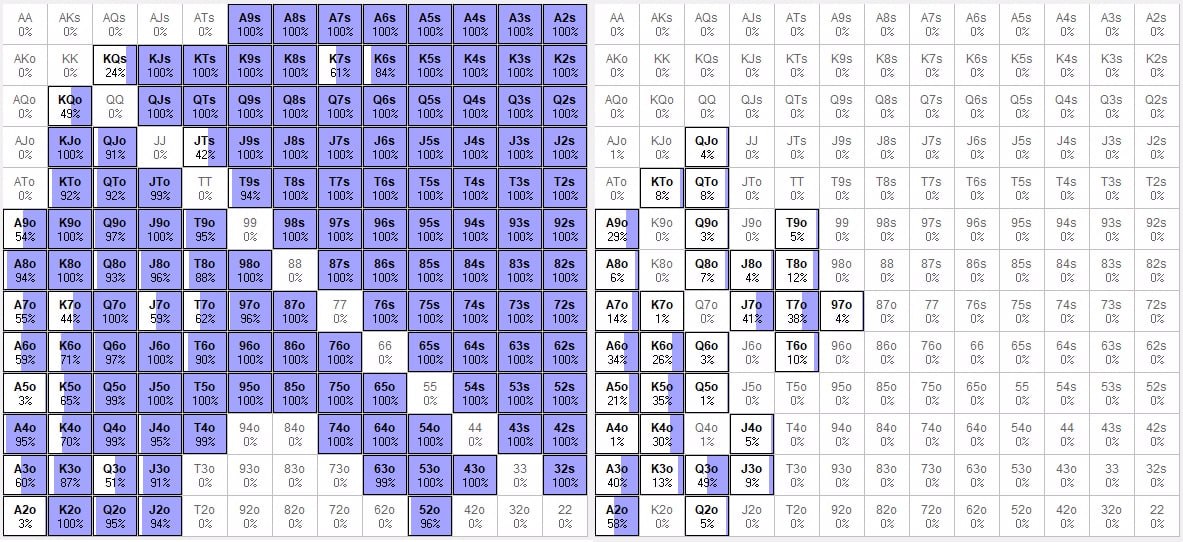 ☝️ Представим стол 8-макс. Это 7 диапазонов оупен-рейза в каждой позиции (которые отличаются для разной глубины стеков). Добавим рейнджи для реакции на рейз и 3-бет, опять же с разных позиций. И это еще не говоря о том, что диапазоны нужно корректировать на баббле, на финалке, с учетом нокаутов. Без феноменальной памяти не обойтись?