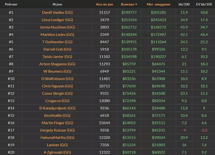🔥 Даниил разорвал всех. Васильев сыграл на GG 31,157 раздач — гораздо больше, чем кто-либо из топ-20. И выиграл тоже намного больше остальных: почти ровно $600k (по ожиданию $501k) с 10.8 EV bb/100. Даниил — постоянный герой шоу «Большие банки» Ильи Городецкого и Иннера. Например, в свежем выпуске две его раздачи (в том числе крупнейшая).