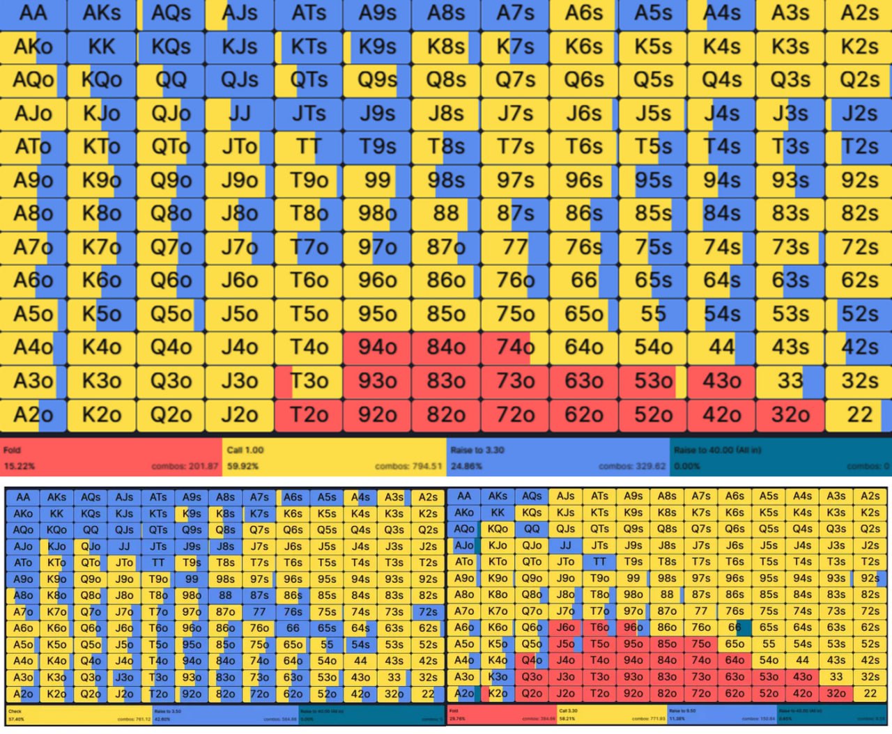 👉 Как защищается большой блайнд? Изолейтов много, больше 40%. Фолдов на рейз 30%, 3-бетов — 11%. Диапазон 3-бета полярный, в блеф солвер рейзит с блокерами (в основном худшие разномастные Ах и Кх). Есть даже пуши 40 ББ: с приличным весом 66, с небольшим — А2о, AJo и AQo. Опять же смотрите скриншот (нижнюю часть). Слева реакция на лимп, справа — на рейз (пасы красные, коллы желтые, рейзы синие).