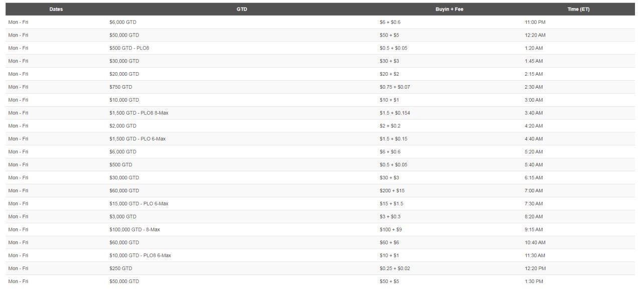 Бай-ины доступны на любой банкролл: самые недорогие начинаются от $2.2, а для хайроллеров предусмотрены турниры вплоть до $25,000. Как обычно, отобраться на дорогие турниры можно через многоступенчатую систему сателлитов.