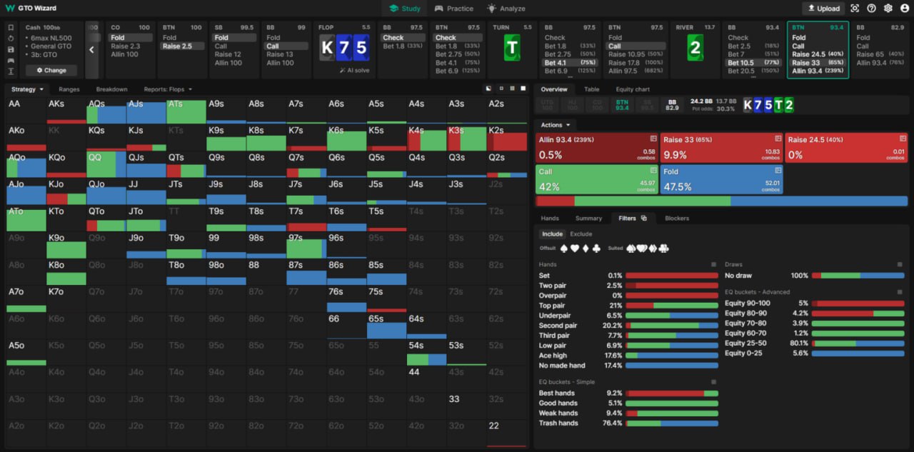 👇 Посмотрите на скриншот внизу. Это спот баттон против ББ, баттон чекнул флоп, а ББ дважды поставил по 75% пота на доске K♠️7♦️5♦️T♣️2♣️. Солвер блефует руки вроде Q7s (третья пара), QT (вторая пара) и даже слабые Кх (К3s и K4s).