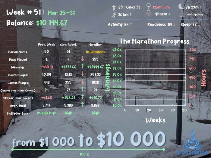 👑 Сэйфспэйс кандидата наук. Регуляр спинов koscience — ученый, который в свободное от работы время еще и умудряется отыгрывать приличные дистанции. В конце марта он закончил подъем с $1k до $10k и поставил новую цель — раскрутиться до $20k. Деньги пригодятся, ведь он решил отдать дочь в хорошую частную школу за $4,000 в год.