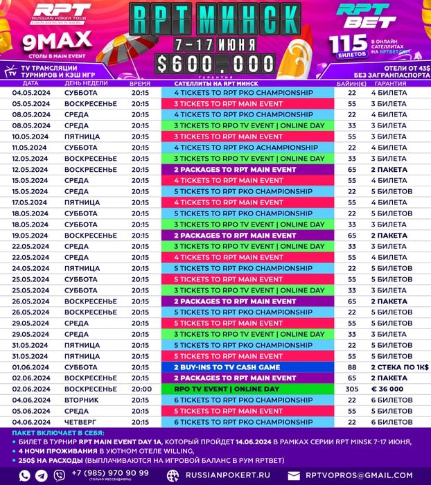 В руме RPTBET стартуют сателлиты к летнему этапу Russian Poker Tour, который пройдет с 7 по 17 июня в минском казино «Опера». Игроков ждет доработанное расписание, общая гарантия $600,000, а также турнирные и кэш-пакеты со скидками — все подробности ищите в теме серии на GipsyTeam 🔥