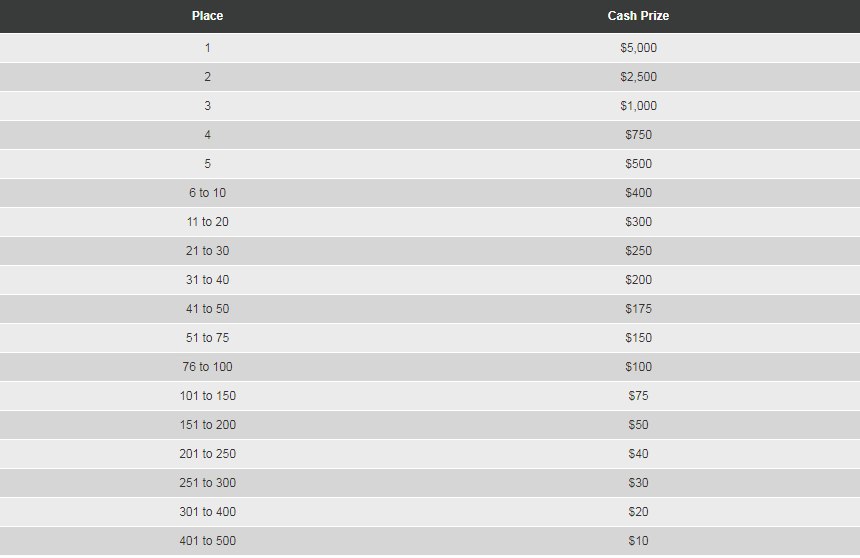 $500 разыграли среди 50 участников, выполнивших задания в спинах. Всего было 535 билетов, 27 человек попали в призы, самый крупный пришелся на atl_____a77 — один билет за $10 и девять билетов по $5.