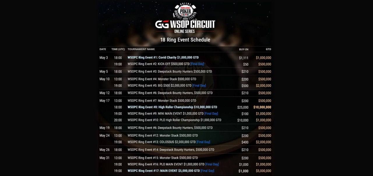 GGПокерОК опубликовали полное расписание ближайшего этапа WSOP-C, который из-за эпидемии коронавируса был перенесен в онлайн. Серия продлится с 3 по 31 мая и будет состоять из 595 турниров на рекордные $100,000,000. Для сравнения: на SCOOP 2020, который начнется 30 апреля, Старзы гарантируют $85,000,000.