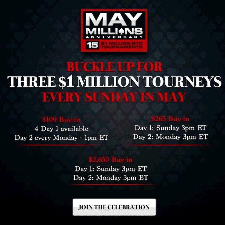 May Millions за $265 и хайроллерский May Millions за $2,650 проходят по воскресеньям в 22:00. Итоговые дни начинаются ровно через сутки.