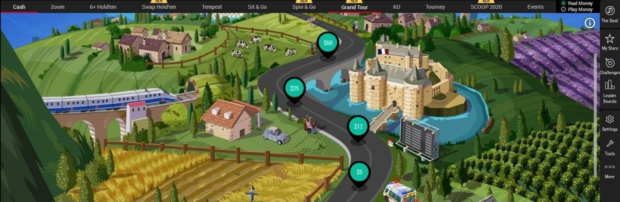 Для профессиональной игры Grand Tour на первый взгляд подходит слабо: на каждом этапе блайнды растут каждые 4-6 раздач, стартовые стеки всего 20 блайндов, а рейк во всех турнирах составляет 10%.