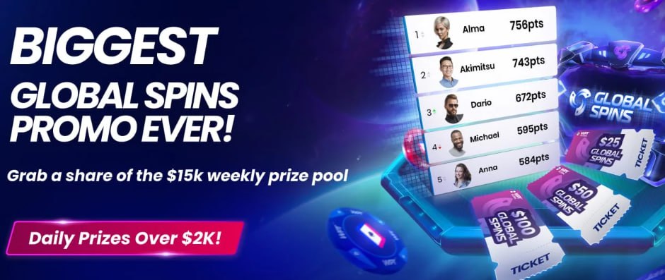 Каждый сыгранный турнир Global Spin приносит одно очко в лидерборд (только спины за $50 дают 0.6 балла). Лидерборды учитывают время с 3:00 по Москве, регистрация автоматическая. Можно участвовать одновременно в нескольких лидербордах.