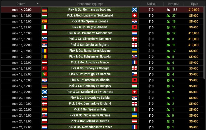 ⛏ В расписании сети GG появились турниры Pick & Go. Каждый турнир приурочен к конкретному матчу, и перед регистрацией нужно выбрать одну из команд. Бай-ин при этом вносится со скидкой, которая зависит от шанса команды на победу (например, прямо сейчас можно выбрать Шотландию и заплатить $1.28 вместо $10). Есть и обратная сторона: если ваша команда проигрывает в основное время, вы вылетаете из турнира.