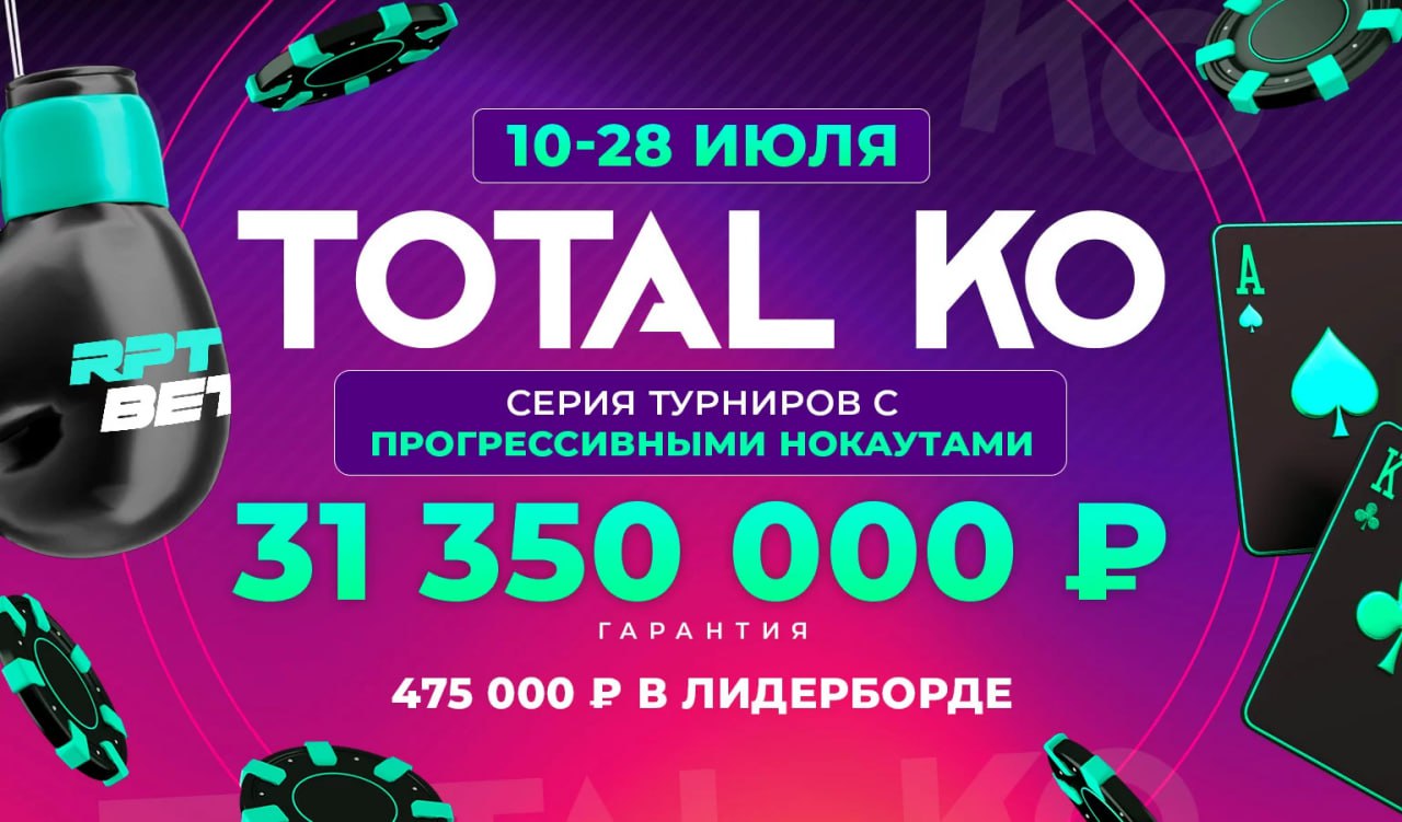 С 10 по 28 июля на RPTBET пройдет турнирная серия Total KO с общей гарантией более 31,000,000 рублей. Игроков ждут 98 турниров по холдему и омахе, все с нокаутами. А под занавес фестиваля пройдут сразу 3 главных турнира: