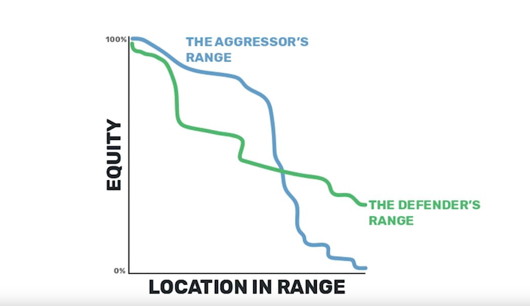 👍 Посмотрите на скришот внизу. Это график распределения эквити, или «эквити-чарт». Часто у более сильного рейнджа будет большой перевес по сильнейшим рукам — но недовес по слабым комбинациям, которые могут быть у коллера (например, при защите ББ). То есть конкурируют более полярный диапазон и рейндж, насыщенный средними руками.