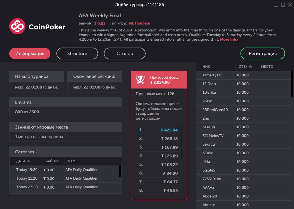 22 и 29 июля пройдут бесплатные турниры с призовым фондом ₮2,024, в которых принимают участие все желающие.