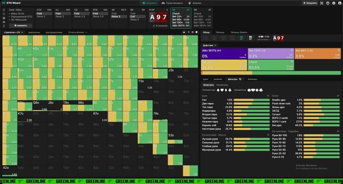A♠️9♥️7♥️. Солвер ставит почаще —треть пота в 33% случаев. Пытаться в точности копировать солвер бессмысленно, диапазоны на практике отличаются, но частоту запомнить легко. С более сильными руками ставьте чаще. В блеф — если есть бекдоры и шанс выбить доминацию. Например, KQ отлично чекает, K2 — ставит. Решение из GTO Wizard смотрите на скриншоте внизу.