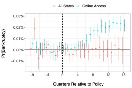 👉 Что в итоге? Исследователи пишут, что обнаружили однозначную корреляцию между легальным беттингом и снижением платежеспособности населения. Доступ к ставкам ведет к ростам задолженностей, снижению кредитного рейтинга жителей соответствующих штатов и росту числа банкротств.
