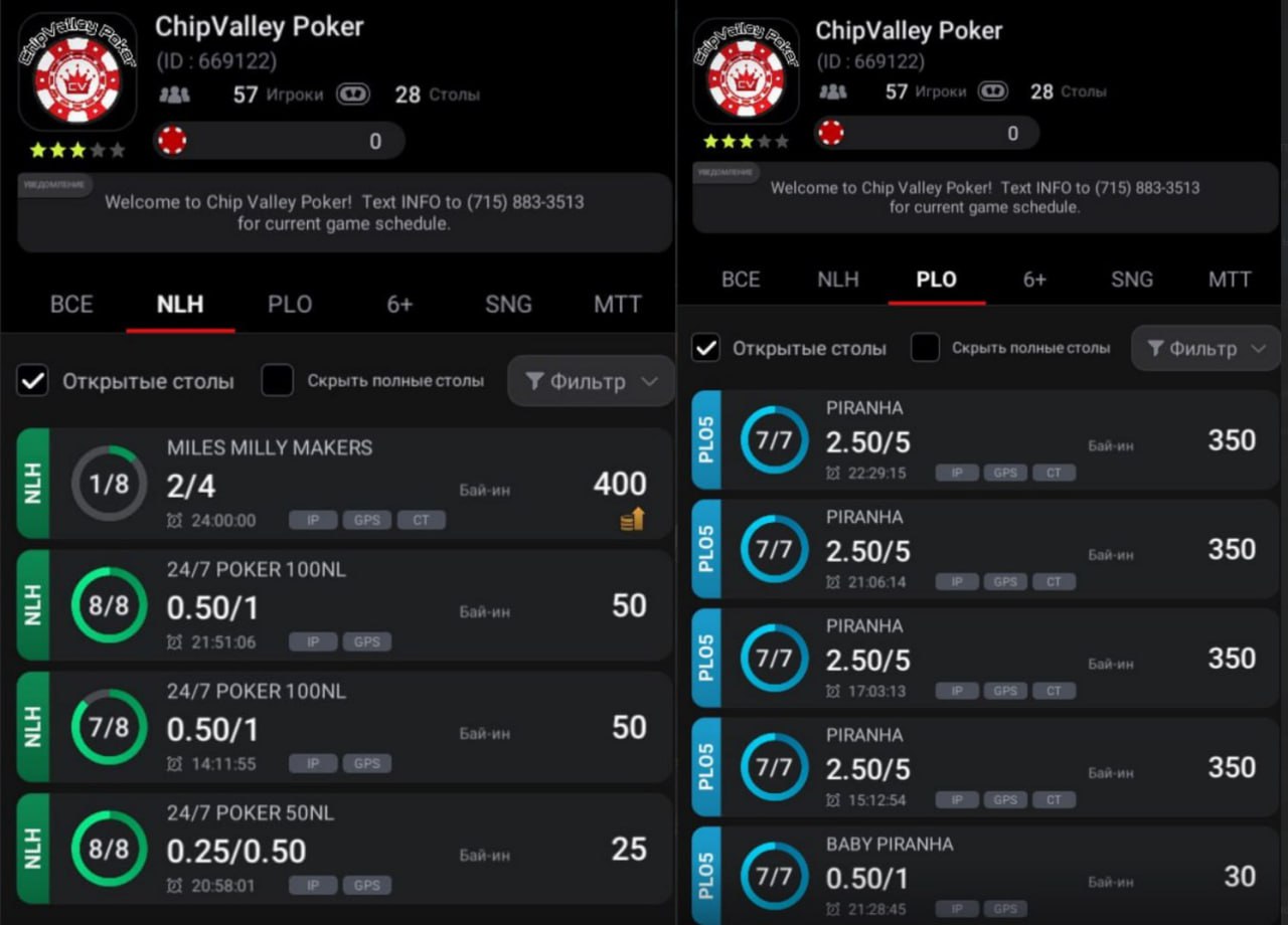 💪 ChipValley Poker. Небольшой частный клуб со смешанным трафиком и отличным полем. Есть недорогой холдем NL60 (иногда играют выше) и классическая омаха до PL1000. Активно играют в PLO5 от PL100 до PL600. Пик трафика — ночь и раннее утро по Москве. Рейкбек от нас до 30%.