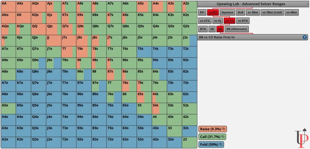 👇 Посмотрите на скриншот внизу. Это защита ББ по солверу против рейза с катоффа. К6о машина вообще не защищает (как и К7о с К8о, коллы начинаются от К9о+). А 87s — это не только обязательная рука для защиты, но и с приличной частотой 3-бетов (около 50% случаев). Главная причина такой разницы — принципиально разная играбельность этих рук.