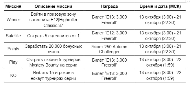 🎫 Миссии с билетами. За выполнение простых заданий во время серии можно получить билеты на фриролл с гарантией €3,000 (22 октября) и турнир Autumn Challenger за €250. Перед выполнением требуется регистрация в меню Missions в клиенте. Список заданий смотрите на скриншоте внизу.