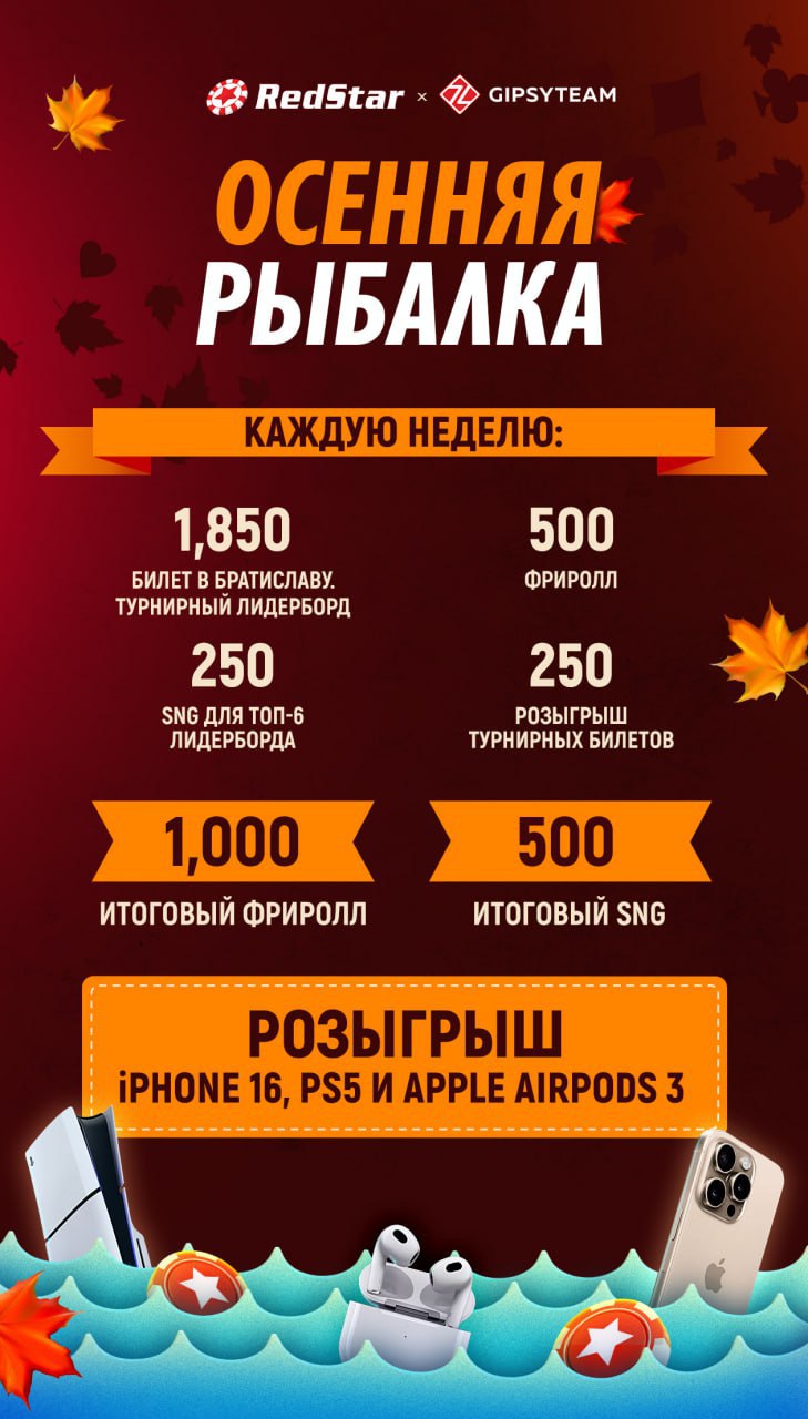Осенняя рыбалка на RedStar Poker: фрироллы, розыгрыши и турнирный лидерборд эксклюзивно для игроков GipsyTeam