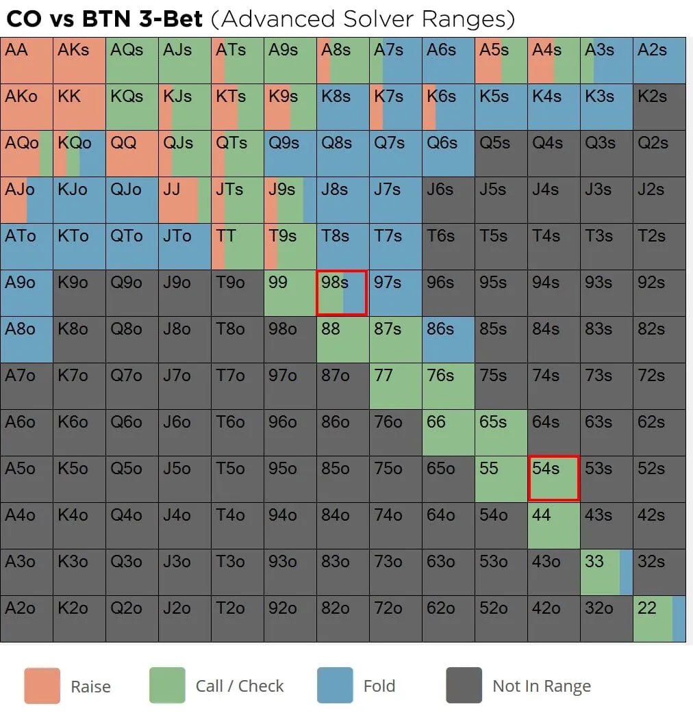 ☝️ У 98s есть важная особенность. На доске TJQ она покупает стрит, но АК собирает натс. И это правда важно — учитывая то, что АК ваш оппонент точно всегда разыграет. Из-за этого солвер не любит коллировать рейзы с 98s и крайне редко ставит 3-беты. Куда реже, чем с 87s или 54s! Так что если перед вами рейз, то машина разыгрывает 98s только на ББ, миксуя коллы и 3-беты (чем на более поздней позиции рейзер, тем больше 3-бетов).