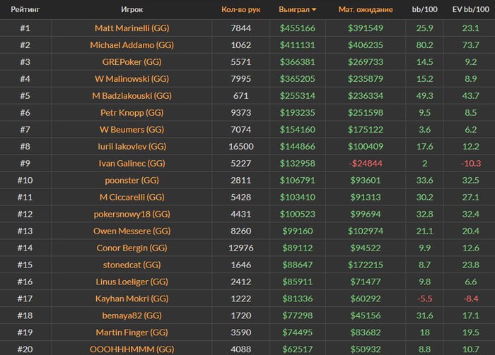 👑 Игрок месяца — Мэттью Маринелли. На GG он за 7,844 раздачи выиграл $455,000, это 26 ББ на 100 — причем почти не перебрал! Известен Мэтт стал пару лет назад, опубликовав в твиттере отчет о выигранном миллионе. Мы тогда писали о нем на GipsyTeam. В сети WPN хиро тоже часто мелькает в топах под ником iluvavrillavigne91 (за сентябрь выиграл $34,000).