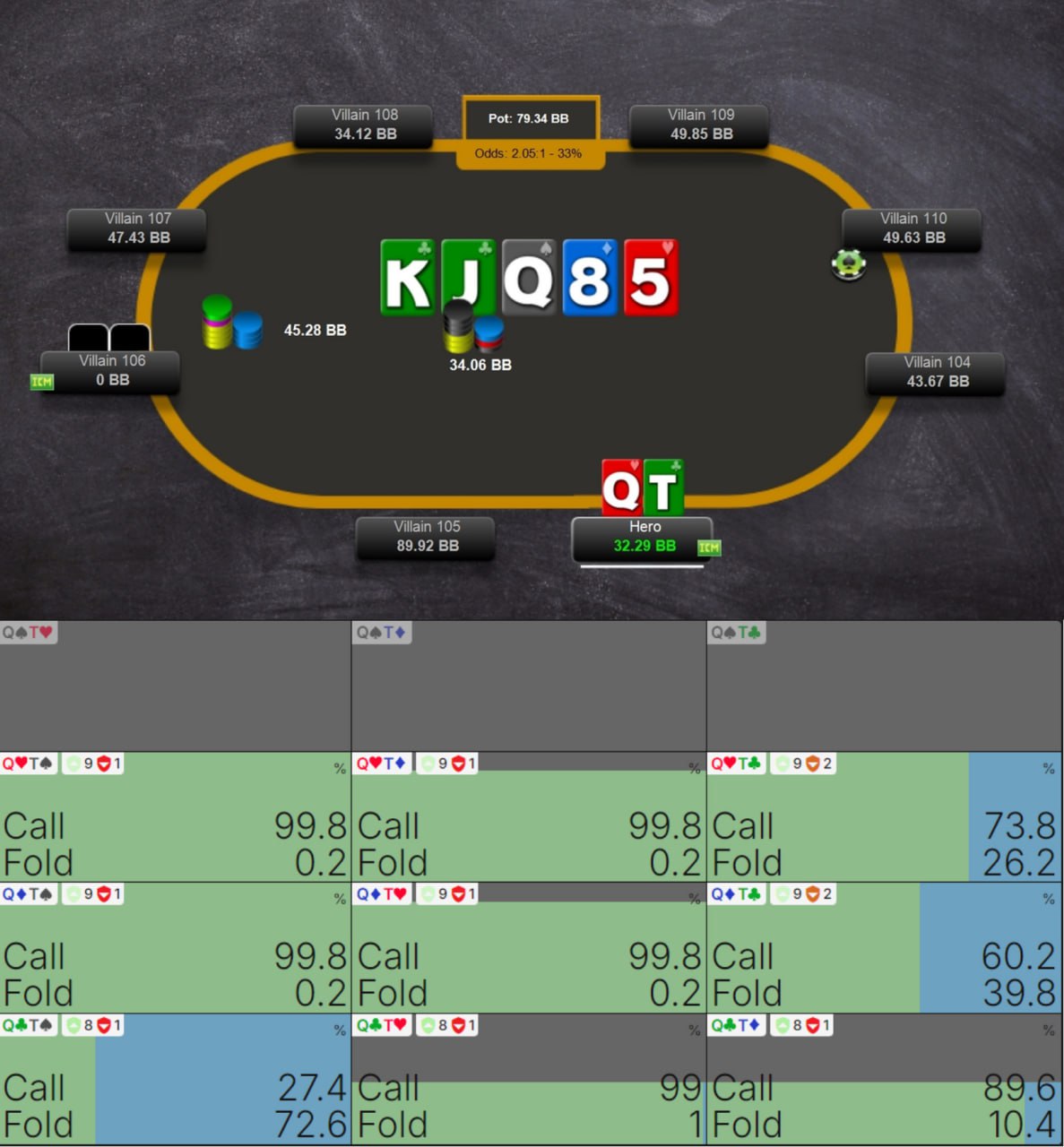 👌 Рука годится для рейза с любой позиции за столом 6-макс. Если играете фулл-ринг, с первых трех позиций можно фолдить, но это не строго. Если состав хороший, можно рейзить и оттуда. В ответ на 3-бет машина всегда играет коллом, но имейте в виду, что она играет против солверного диапазона 3-бета. Если же против вас нит, можно выбрасывать со спокойной душой.