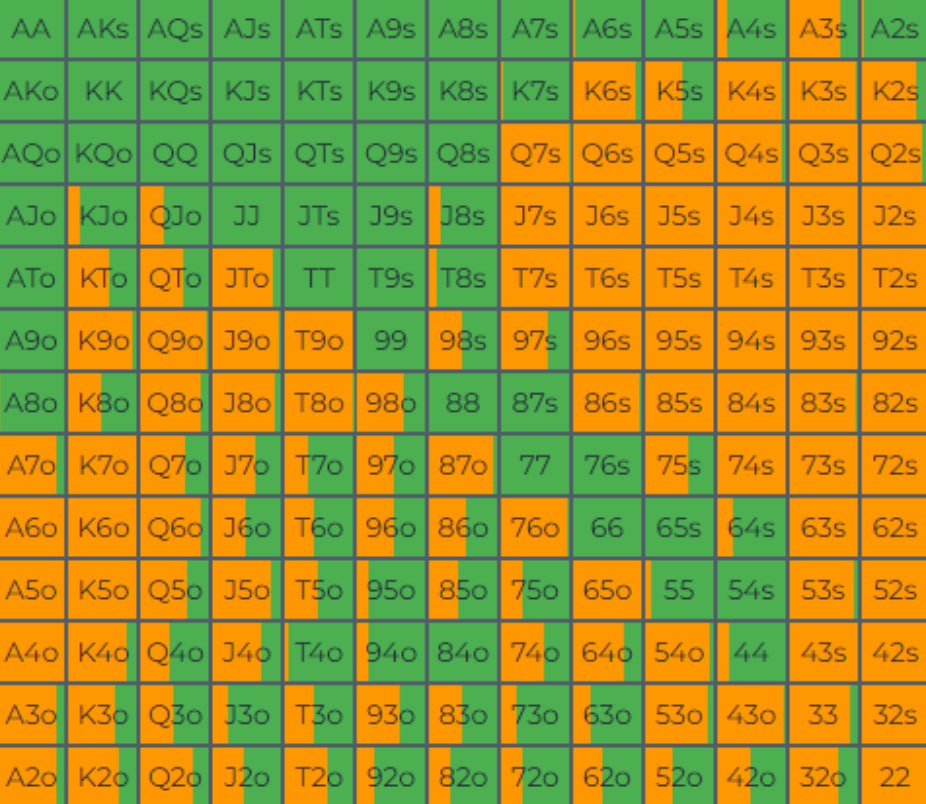 2️⃣ Миксуйте велью и блефы. Посмотрите на чарт внизу. Он для эффективного стека 50 ББ, зеленый цвет — рейзы, золотой — чеки. Обратите внимание, что чарт включает и руки, которые могут рейзить и коллировать лимп-рейз (АА, KJo, T8s), и те, что играют рейз-фолд (84о, Т6о и так далее).