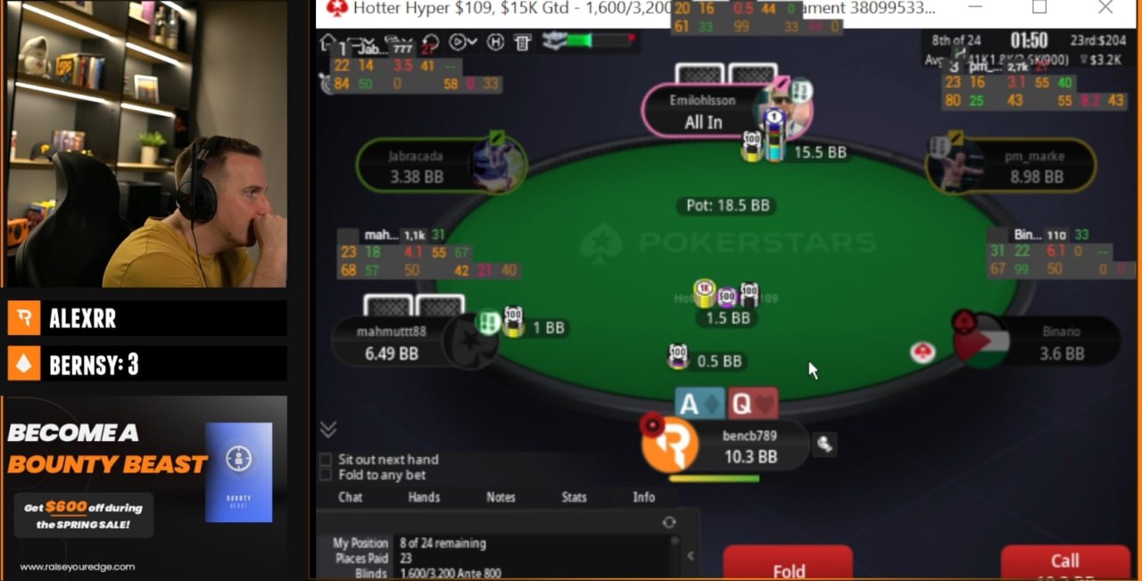 Бен показал в твиттере раздачу, сыгранную на баббле гипера за $109 на PokerStars. Осталось 24 игрока, в ITM попадут 23, Бен со стеком 10.8 ББ сидит на SB с AQo. Это восьмой стек в турнире (ох уж эти гиперы). Чиплидер стола (15.5 ББ) запушил с хайджека. «С чем бы вы платили тут?», — обратился к подписчикам Ролле. И тут же рассказал, как тут играет машина (с учетом ICM) 👇