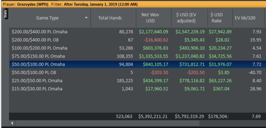 В разгар громкой дуэли на форум заглянул литовский топ-рег Гразвидас Контаутас (Grazvis1) — он тоже считается одним из лучших игроков хедз-ап PLO. Известно, что за один только 2018-й он заработал на Старзах около $2 млн — а теперь выложил результаты в сети WPN с 1 января 2019-го. За 6 лет он заработал $5.4 млн до рейкбека со средним винрейтом 7.7 ББ на 100 (смотрите скриншот внизу). Гразвидас ответил на вопросы (и восхищенные возгласы) комьюнити, вот несколько цитат: