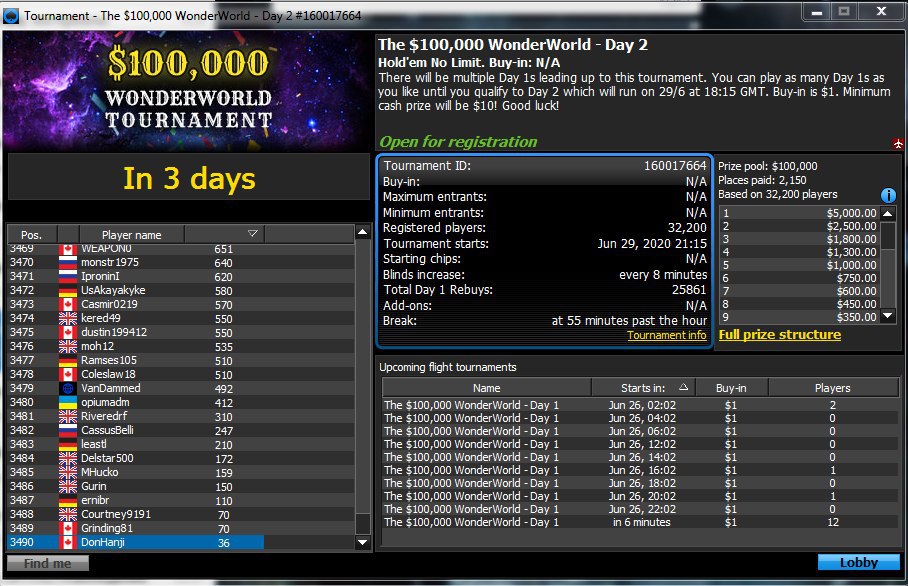 Первые дни в турнир проходят ежедневно: чтобы отобраться в финал, нужно продержаться 12 уровней или попасть в топ-11%. Более простой и совершенно бесплатный способ: играть в ежедневных фрироллах $1,000 WonderWorld Freeroll, где разыгрывается по 1,000 билетов в турнир. Условия простые: фриролл открыт для всех, кто когда-нибудь делал депозит на 888poker,