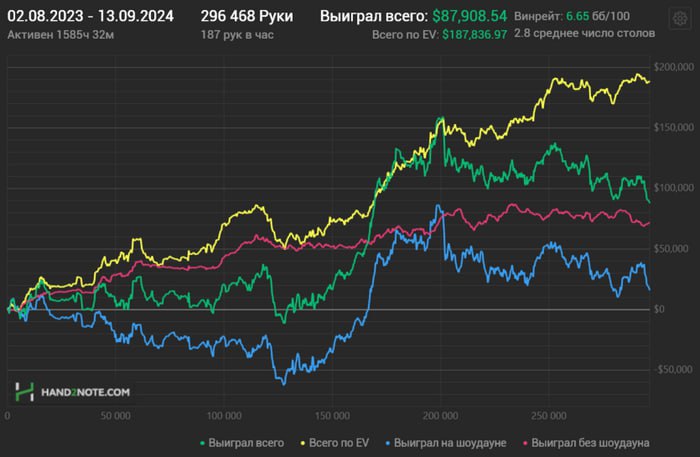 🤠 Переап месяца. Удивительные результаты показал на GG игрок с ником Sikeston. За 438 раздач он выиграл $100,000, это 200 ББ на 100 рук. По EV же должен был выступить в -400 ББ на 100 и проиграть $162,000. Иногда нажимать можно любые кнопки — и всё равно всё будет хорошо!