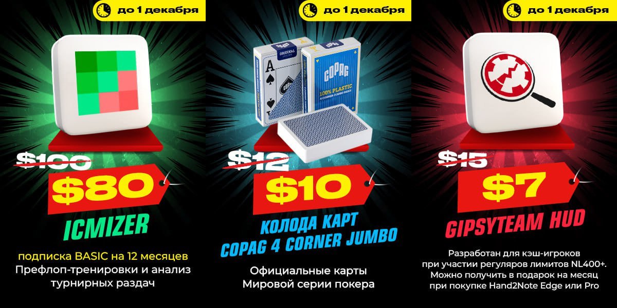 Последние дни ноября — время больших скидок в магазинах по всей планете. В том числе и магазинах покерных! Так что если давно собирались вложиться в обучение, приодеться или купить покерный набор — лучше момента не придумать. На GipsyTeam началась акция «Таймбанк до 1 декабря»: со скидками до 50% продаются солверы, калькуляторы, конвертеры, худи, карты и многое другое 🔥